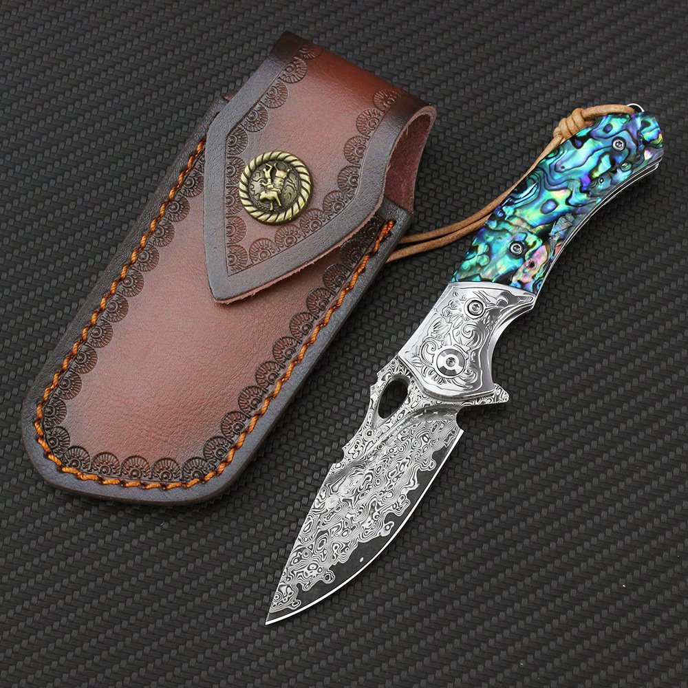Outdoor knife VG-10 Damascus steel folding knife collection camping field sand iron wood color shell folding knife